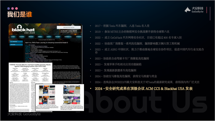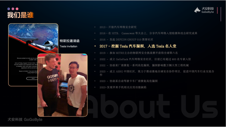 结合一下我们公司团队的背景,我们公司在2013年开始关注网络系统安全,2020年我们开始公开分享一下智能汽车的入侵检测系统,向全球交流分享,也挖掘了很多的漏洞。