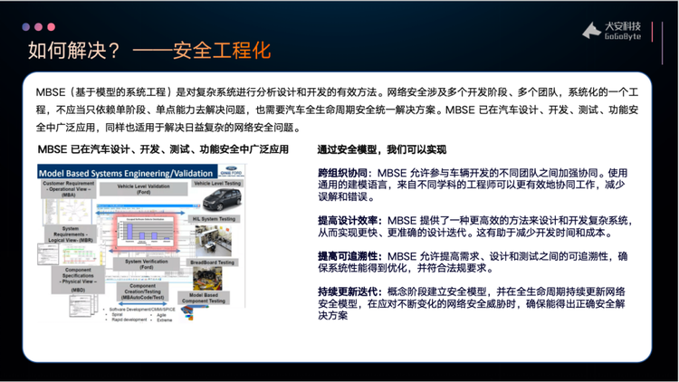 所以我们去借鉴了美国这种大的机构,像NASA或者是波音做飞机这种复杂系统,复杂的全球供应链项目里面用到的工程化的MBSE,我们基于它来做整个系统的模型,基于这个模型我们后面可以做很多安全设计、安全测试、安全运维的工作,接下来我给大家稍微讲一下。