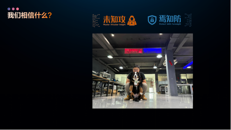 所以我们犬安科技的实验室里面你可以看到时刻提醒自己,一定要去理解攻击以黑客的思维去思考我们要解决的这些问题,我们给客户提供的服务和产品也必须从一个对抗攻击角度去设计。