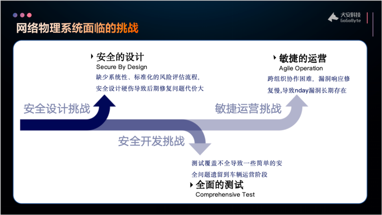 我们就举个例子,刚才讲了网络物理系统一个大的背景面临的挑战,我们总结下来过去基于我们跟各种车企,像通用、特斯拉和国内的车企,交流之后我们总结出来网络物理系统的三大挑战: