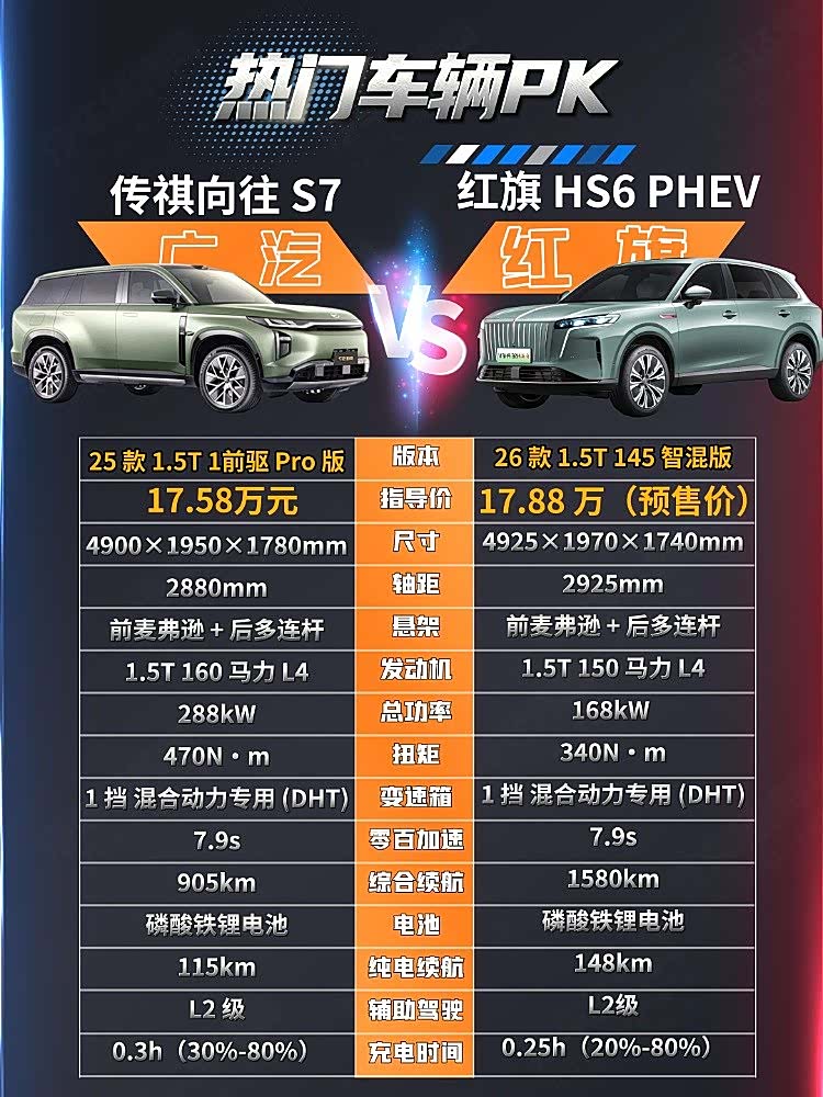 红旗HS6 PHEV 2026款145智混版预售价为17.88万元,传祺向往S7 2025款115km Pro版售价为17.58万元,两款车定位、售价都比较接近,而且都采用了插混系统,那么哪一款车更值得入手呢?