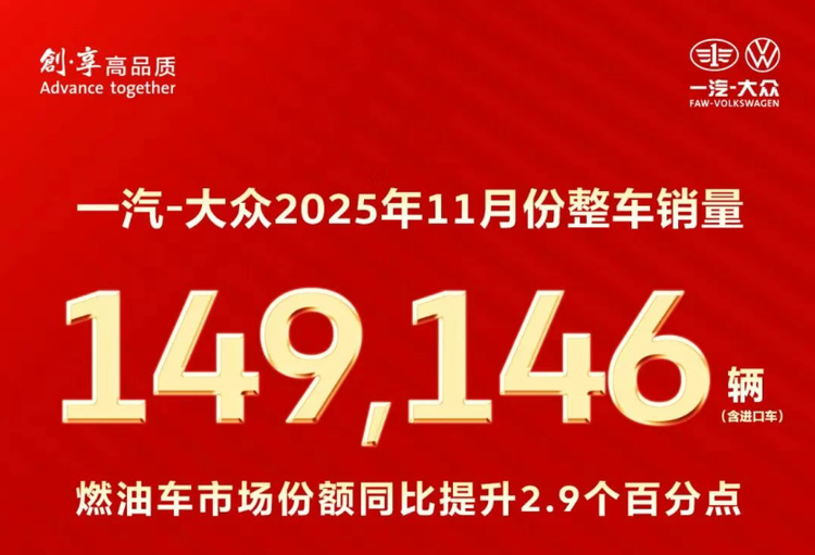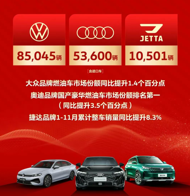 2025年11月中国车市寒意渐浓,根据乘联分会的数据显示,11月国内乘用车零售同比下滑8.1%,燃油车市场更是遭遇22%的同比下滑。但在这样的弱市环境中,一汽-大众交出了一份亮眼答卷:11月销量149146辆,环比10月增长7.4%,旗下大众、奥迪、捷达三大品牌燃油车市场份额全部实现同比正增长,燃油车整体份额同比提升2.9个百分点。这份成绩单不仅逆势领跑合资品牌,更揭示了车市转型期的生存密码。