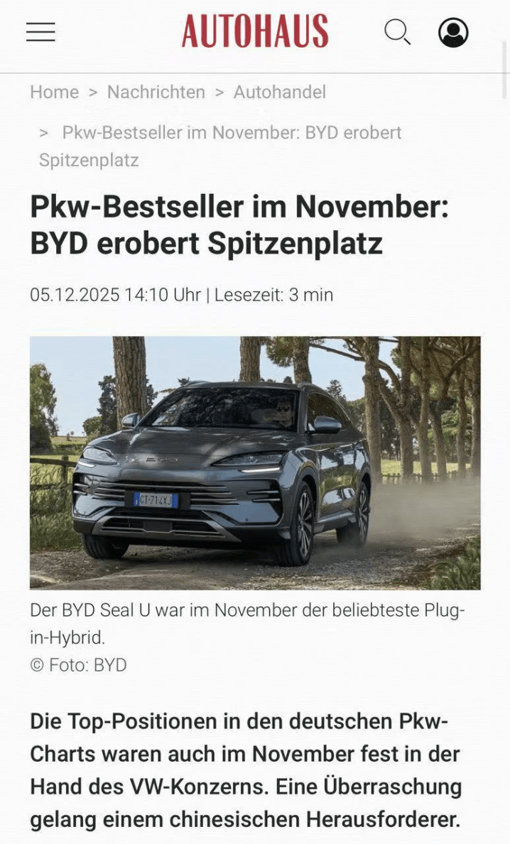 车家号·0浏览·2025-12-11 14:58 · 北京近日,BYD SEAL U(宋PLUS)成为德国11月车市插混车型销量冠军,引发行业广泛关注。这不仅是中国汽车品牌首次在德国主流细分市场登顶,更意味着比亚迪在欧洲的发展规模已进一步提升。
