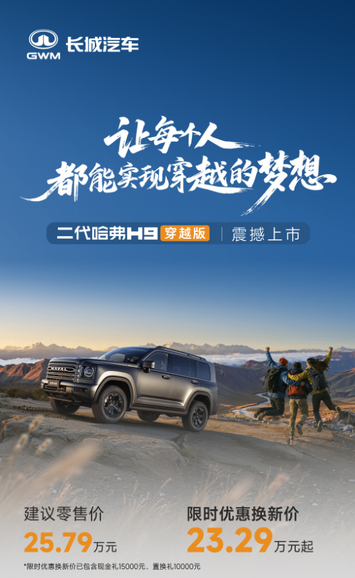 价格和权益才是二代哈弗H9穿越版的“杀手锏”,它的官方上市建议零售价25.79万元,限时优惠换新价23.29万元起。要知道,同样具备长途穿越能力的豪华越野车,价格动辄七八十万甚至上百万,二代哈弗H9穿越版直接把门槛砍到三分之一。更厚道的是金融礼、质保礼、智联礼一应俱全:至高12万36期0息,整车5年或15万公里超长质保,首任非运营车主还能享受发动机、变速器终身质保,3年免费娱乐服务流量更是锦上添花。这种“亲民价+高保障”的组合,让普通消费者不用再为梦想“咬牙买单”。