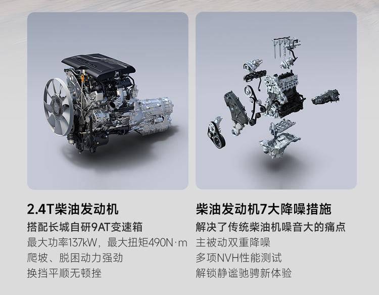 要想越野性能好离不开强劲的动力性能,二代哈弗H9穿越版搭载2.4T+9AT动力组合,扭矩充沛,起速快且换挡平顺,柴油发动机凭借长城汽车深厚的技术积淀,具备预热快、高温散热快的优势,在高海拔环境下动力衰减率仅5%,可快速适应极端气候。底盘、悬架、转向等关键部件用料升级,防腐能力突出,轮眉及固定侧踏饰板等易磨损部位采用皮纹设计,更具耐用性。此外,新车标配2.5吨拖车资质,可轻松拖拽房车、摩托、UTV等装备,大幅拓展户外出行半径。