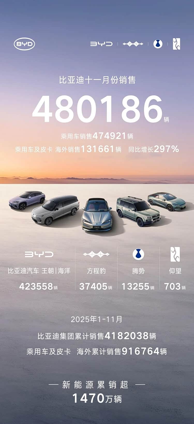 作为自主车企的“领头羊”,比亚迪11月的表现亮眼。在国内市场一共卖了34.83万辆,但面对着吉利等竞争对手的奋力追赶,仍有一定的竞争压力;而在海外市场却迎来爆发,11月海外销量13.19万辆,同比暴增2973.26%,首次实现单月破10万辆的大关,成为品牌销量的核心增长极。从品牌矩阵来看,王朝+海洋系列依旧是销量基石,贡献了42.36万辆的成绩;高端品牌阵营表现亮眼,方程豹单月售出3.74万辆,同比增幅高达339%,腾势交付1.33万辆,仰望也有703辆的进账。技术路线上,纯电动车型销量23.75万辆,同比增长19.9%,插混车型23.74万辆,同比下滑22.4%,纯电车型的增长速度已远超插混,技术结构持续优化。截至11月底,比亚迪前11月累计销量达418.2万辆,同比增长11.3%,已完成460万辆年度目标的91%,全年目标达成基本无忧。