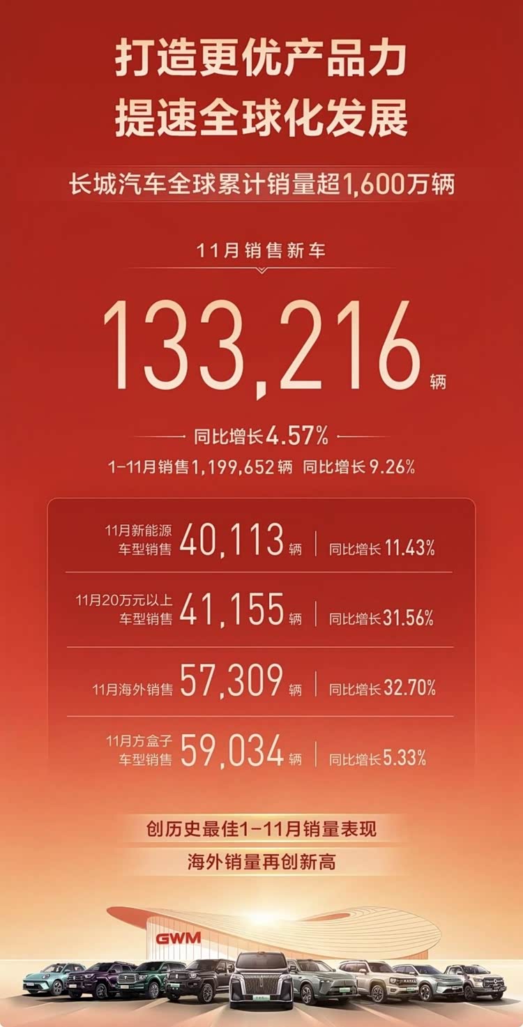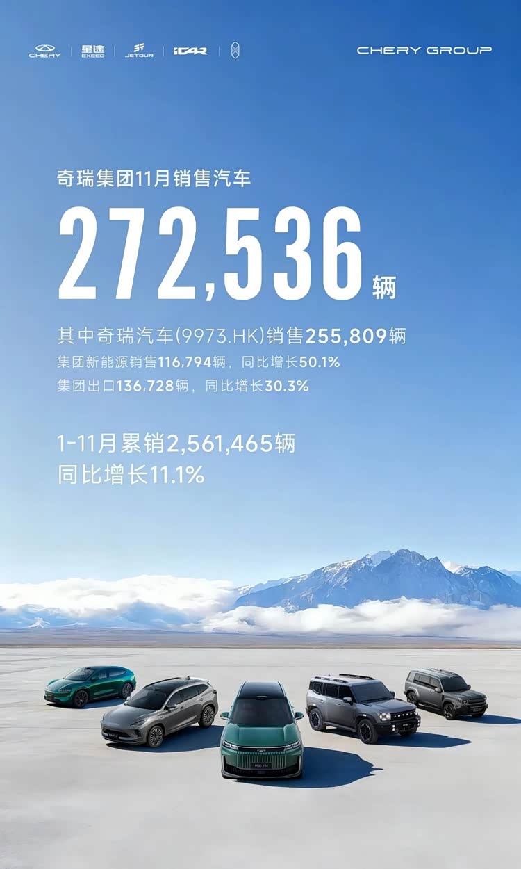奇瑞集团11月虽以27.25万辆的销量位列第四,且是五强中唯一环同比双下滑的企业,但在出口和新能源领域依旧亮点十足。出口方面,11月奇瑞出口13.67万辆,同比增长30.3%,连续7个月单月出口破10万辆,持续坐稳中国汽车出口第一的宝座,欧洲、南美市场成为其核心发力区域。新能源领域也实现了突破,11月销量11.68万辆,同比增长50.1%,连续4个月保持增长,其中iCAR品牌售出1.14万辆,同比增幅99%,成为新能源板块的新增长点。不过品牌发展也存在短板,星途品牌同比下滑24%,高端化进程仍存阻力。前11月奇瑞累计销量256.15万辆,同比增长11.1%,整体发展态势保持稳健。但300万辆的这个坎,今年跨过的可能性不大,预计整体销量会在285-290万之间.