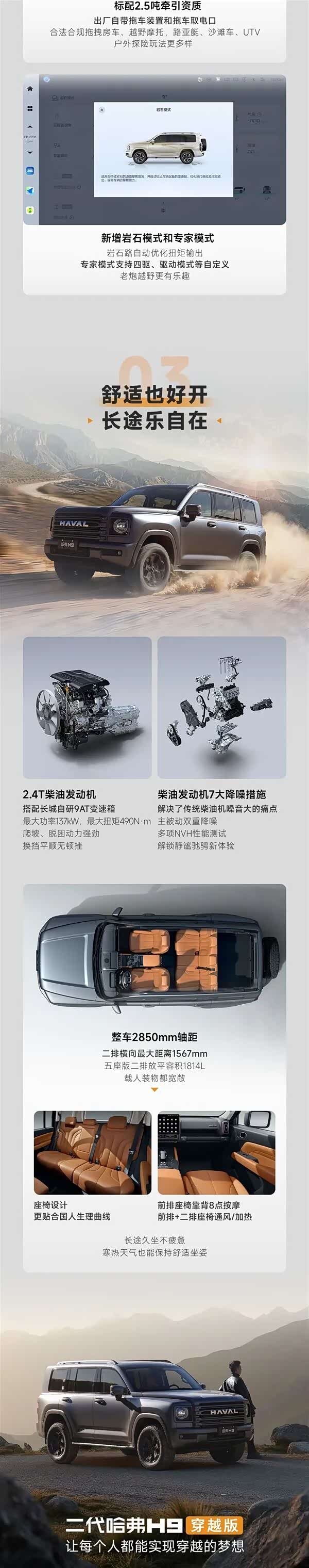 动力方面,新车依旧搭载2.4T柴油发动机,最大功率137千瓦,峰值扭矩490牛·米,匹配9速自动变速箱,标配硅油风扇并配备131L原厂双油箱,续航可达1400km。并配备前后桥电控限滑差速锁、博格华纳TOD适时四驱系统,其提供9种驾驶模式,其中新增岩石模式和专家模式,另外还具备2.5吨拖车资质,方便有旅行需求用户用车。