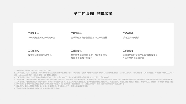 如此全面的产品力,对应的是极具诚意的市场策略。第四代博越L以“入门即高配”为理念,全系标配了包括GEEA 3.0电子电气架构、Flyme Auto座舱、手机蓝牙钥匙等在内的50多项配置,并拥有24项同级独有及26项同级领先优势。当前,官方还推出了限时购车权益:包括1000元订金抵8000元购车金的“三好现金礼”;全系限时免费享至高10000元配置的“三好升舱礼”;2年5万元0息贷款的“三好金融礼”;换购补贴至高15000元的“三好焕新礼”;首任车主基础流量免费及3年免费娱乐流量的“三好流量礼”;以及博越老用户的3000元专属换购感恩礼。活动有效期至2025年12月31日。