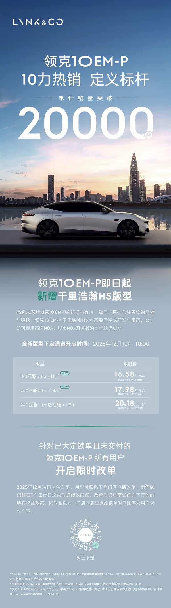 车企产品迭代的核心逻辑正从“车企定义产品”转向“用户需求定义产品”,能快速捕捉用户反馈并调整产品体系的品牌,才能持续收获用户信任。近日,领克10 EM-P迎来销量突破2万台的里程碑,2万用户的选择印证了其对用户需求的精准洞悉,其提供的全场景出行方案化解了用户的核心用车痛点。为进一步回应用户对差异化辅助驾驶的需求,品牌加推千里浩瀚H5版型,交付即可使用相关辅助驾驶功能,限时价16.58万元起,用灵活的配置组合回馈用户信任。