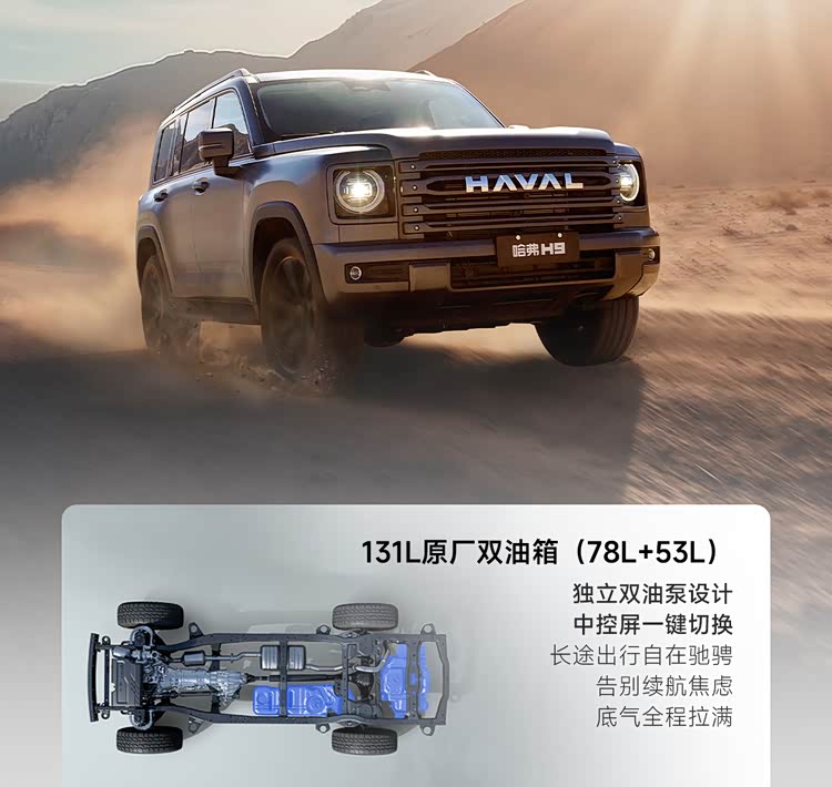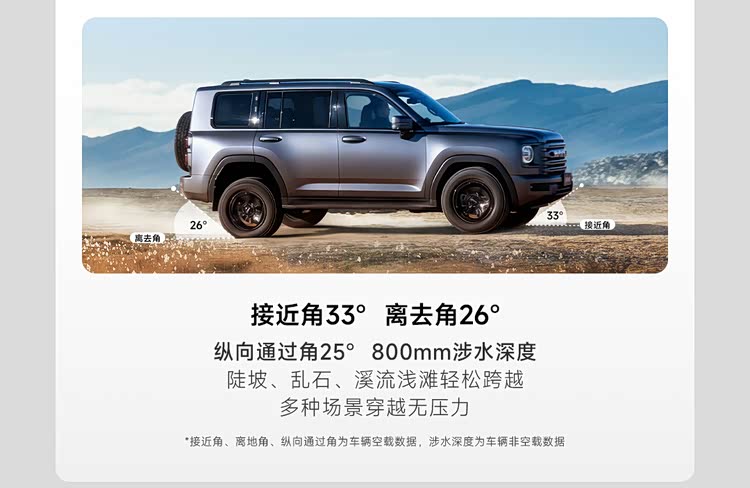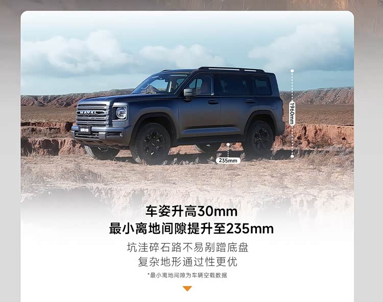 首先还是设计,哈弗H9穿越版沿用现有的方盒子造型,这部分是没有太多调整的。整车对户外能力进行了升级,并且提供了全新的灰色车漆。轮胎部分直接配备了265/65 R18规格的AT胎,相比HT胎的胎壁更厚,花纹也更深,能够满足中高强度的越野需要。除了轮胎和车漆之外,新车的车身高度提升了30mm,而其他的外尺寸没变。最小离地间隙从之前的224mm,提升到了235mm。因为离地间隙的提升,接近角从此前的31°增加到了33°,离去角不变。最大涉水深度也维持在800mm的水平,能够应付大部分的涉水路况。