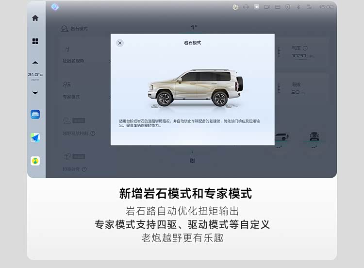 车内则没有太多的变化,依然是充满野性的简约设计,配备10.25英寸液晶仪表,搭配14.6英寸中控触屏。前排给了50W的无线充电面板,USB接口数量也很丰富,车内补能是比较方便的,适合长途越野。座椅配置层面与勇士版相当,前排标配四向腰部支撑调节,以及通风加热和按摩功能,二排座椅也支持通风和加热功能。座椅形式依然支持5座和7座两个版本。