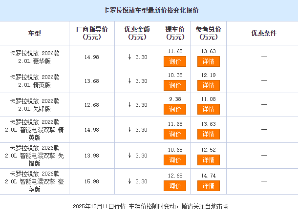 买车终究是按需选择,若核心需求是家用代步、省心省钱,降价后的 卡罗拉锐放(参数|询价)无疑是优质选项;若追求更强的动力和科技体验,或许可再横向对比。但就当前优惠力度而言,这款务实派SUV确实给出了难得的入手时机。