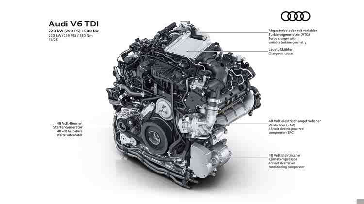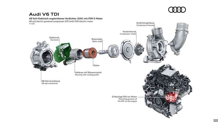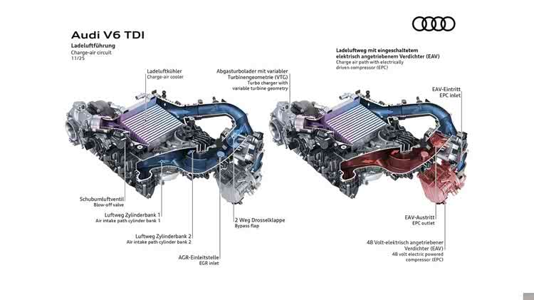 这款六缸柴油引擎将首次搭载于A6和Q5车型,它将轻油电混合系统与电动压缩机配对。虽然Ingolstadt以前曾推出过48V的V6柴油引擎,但这是MHEV硬件首次与电动压缩机结合运作。该装置安装在进气路径中的涡轮增压器和中冷器之后。