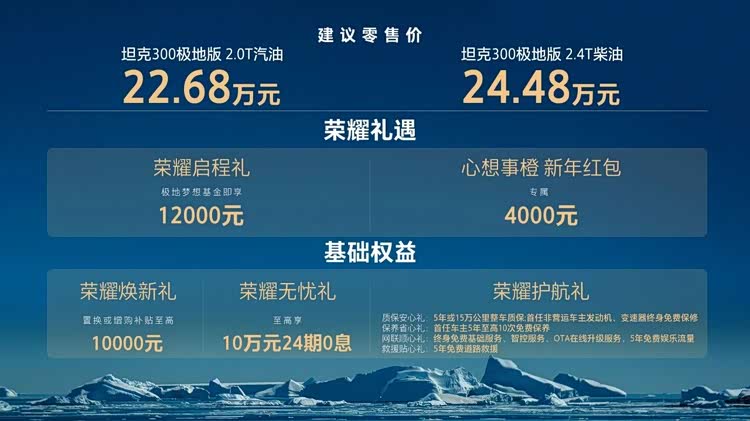 2025年12月11日,在坦克300全球用户达成50万之际,坦克300极地版正式上市。官方建议零售价,坦克300极地版2.0T汽油22.68万元,坦克300极地版2.4T柴油24.48万元,并推出荣耀启程礼、心想事橙新年红包和多项基础权益等多重购车礼遇。