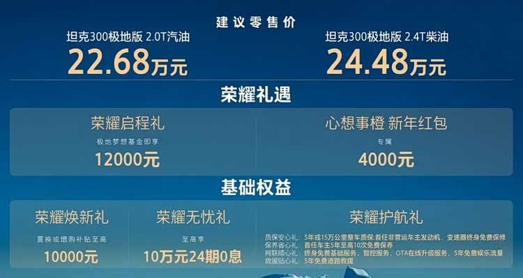 【懂车之道 产品】近日,懂车之道获悉, 坦克300(参数|询价)极地版正式发布上市,新车提供2.4T柴油与2.0T汽油双动力,官方售价区间为22.68-24.48万元。新车限定300辆销售,本月下旬正式开启交付。下面,和大家一起来看看新车的产品力如何?