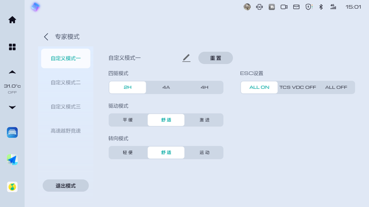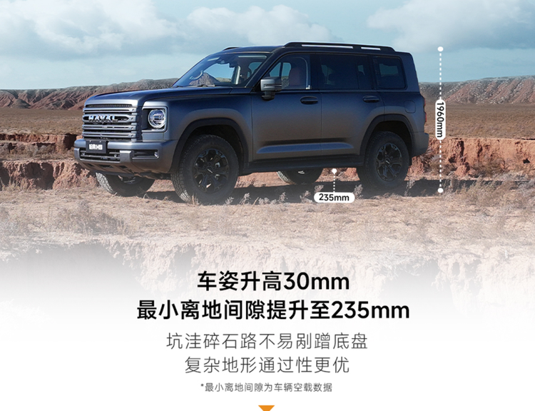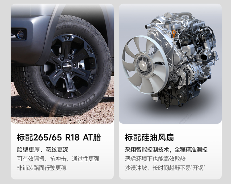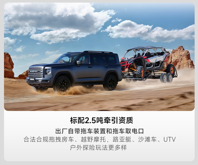 越野部分标配前、后桥电控式差速锁,不用自行改装就能解决越野时大多数使用场景,而标配的硅油风扇则能在长时间越野运转时提高散热能力,解决沙漠冲破、长时间越野不易“开锅”。驾驶模式则新增岩石模式和专家模式,专家模式支持四驱、驱动模式等自定义功能。另外,为了满足用户对拖挂的诉求,新车标配2.5吨拖车资质。