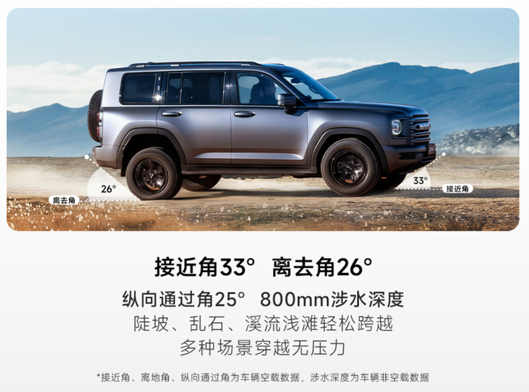 其次,车身姿态也做了调整,抬高30mm后最小离地间隙升至235mm、接近角33°、离去角26°、纵向通过角25°、涉水深度800mm。通过官方成熟的标定,在提升极限通过性的同时,也确保了车辆动态平衡与长期可靠性。轮胎配置方面,新车直接标配固铂AT3 265/65 R18 AT胎,后期车主也无需考虑更换轮胎尺寸带来的年审问题。