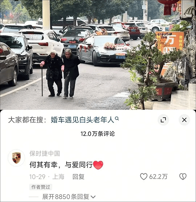 10月29日,博主@大方KK街拍发了一个视频:一辆保时捷Panamera婚车,在转角处遇到一对白发苍苍的老夫妇弓着腰相互扶持着牵着手。婚车与恰巧入镜的一对老人,意外构成了一幅“白头偕老”的圆满图景。