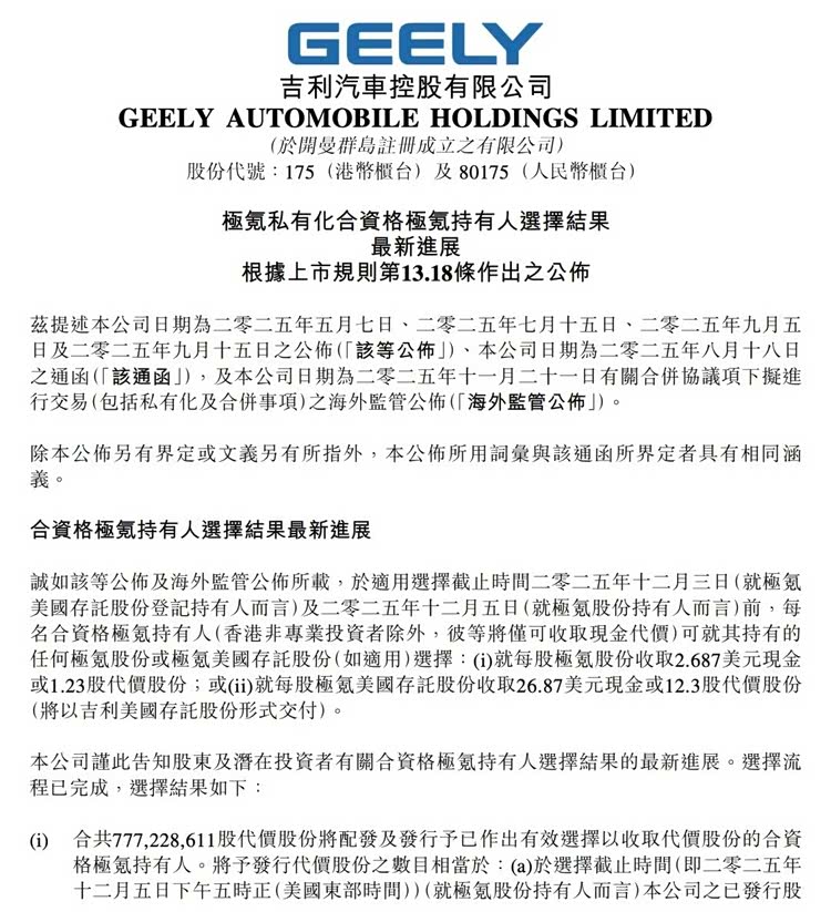吉利汽车控股有限公司发布公告,公布极氪智能科技控股有限公司私有化交易中,持有人对价选择的最终结果和落地方案。每股极氪股份可换取2.687美元现金或1.23股吉利汽车对价股份,每股极氪美国存托股份可换取26.87美元现金或12.3股吉利汽车美国存托对价股份。