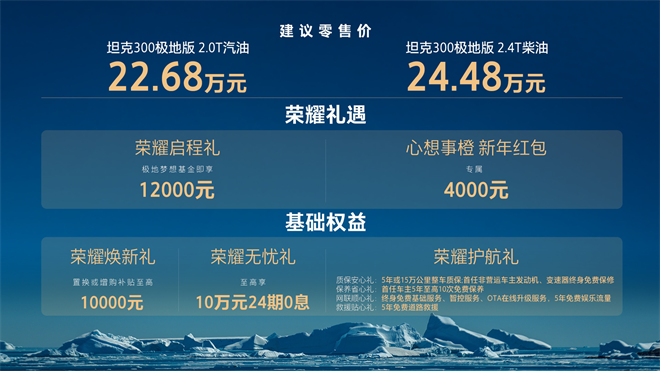 2025年12月11日,在 坦克300(参数|询价)全球用户突破50万的历史性时刻,坦克300极地版正式上市。这款新车型提供2.0T汽油和2.4T柴油两个版本,售价分别为22.68万元和24.48万元。