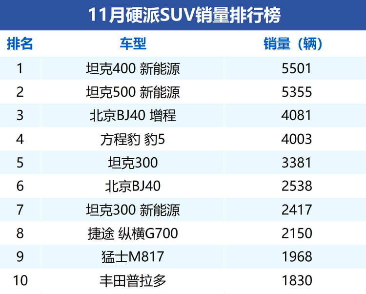 不出预料,今年11月硬派SUV市场又被坦克汽车“霸榜”了,销量榜冠军、亚军席位均被坦克汽车夺得,可见品牌在硬派领域占据极高话语权。同时方程豹、北京越野表现也颇为亮眼,还有捷途纵横新车型强势挺入榜单前十,下面来看看具体的销量榜单: