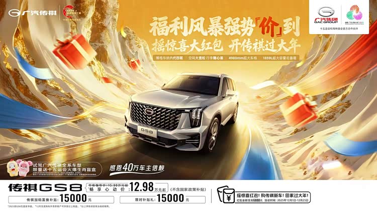 除了产品力硬核之外,12月的促销力度也让 GS8 成为不少消费者心中的“年末最值之选”。当前购车可享受15000元限时补贴、15000元置换补贴,还有留资摇赢至高 6888 元红包活动,同时,到店试驾可获赠“大湾鸡”联名盲盒礼品。