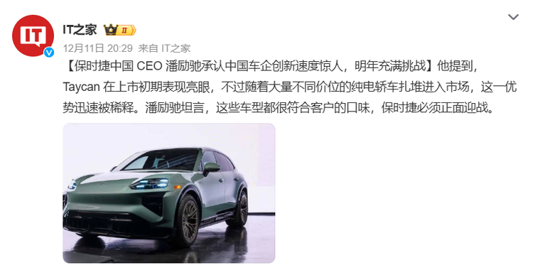中国本土汽车品牌,特别是在新能源汽车领域的技术创新和产品更新速度,被保时捷高层视为主要挑战之一。