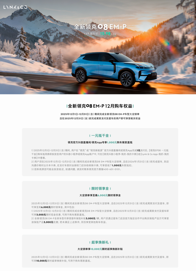 好车的意义,终究是为了提升家庭出行的品质与效率。全新领克08 EM-P以全面均衡的产品力,精准契合进阶家庭的出行追求,而年末的政策红利与品牌让利,更让这份高品质出行触手可及。抓住这难得的购车时机,给生活一份实在犒赏,奔赴每一段温暖惬意的日常旅程。