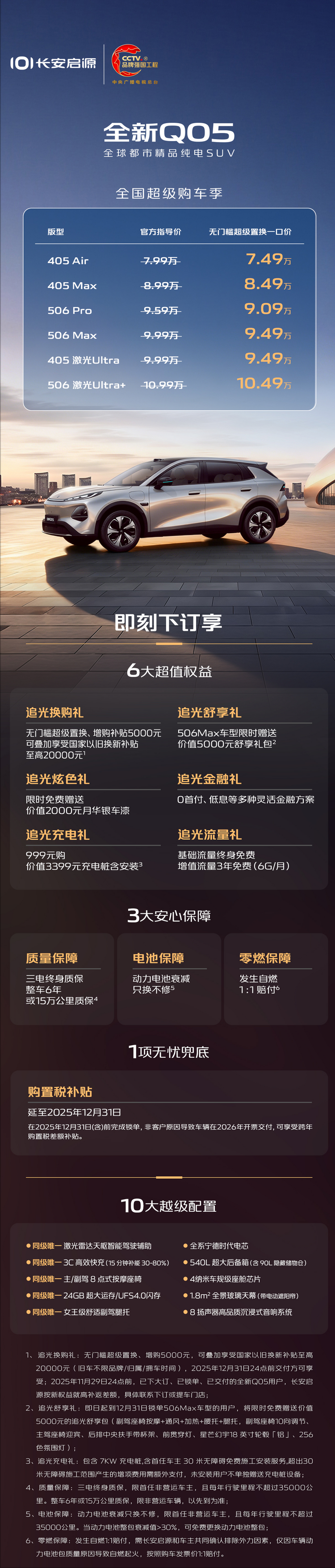 11月29日,长安启源全新Q05开启“超级购车季”,并宣布全面刷新用户购车权益,涵盖整车及三电系统的“三大安心保障”、购置税兜底政策延续至12月31日。同时,重磅推出全系无门槛超级置换、增购一口价,立省5000元,低至7.49万元起,并承诺对11月29日24点前“已下大订、已锁单,已交付”的用户,按照超级购车季新权益就高补返差额。