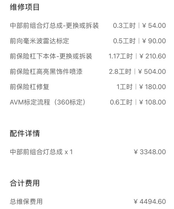 目前网上已经有全新小鹏P7前后灯组的磕碰维修案例,有车主的前大灯磕坏了一点点,却需要更换中部前组合灯、前向毫米波雷达标定、前保险杠覆盖件等,算上工时费后总费用接近4500元;还有车主磕坏了左后方灯组,光是大灯总成价格就高达5200元,维修总费用超过7000元。除了维修成本高以外,还有人担心保险公司会上涨该车型的保费,陡增车辆养护维保费用。