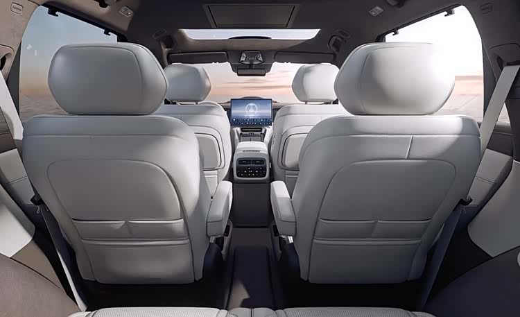 车内采用31.8㎡软质包裹,使用母婴级环保材料。座椅采用2+2+2六座布局,第二排“女王座椅”支持前后100mm滑移与靠背角度调节,第三排座椅支持100mm前后滑移和电动调节,全车有多达49个储物空间。