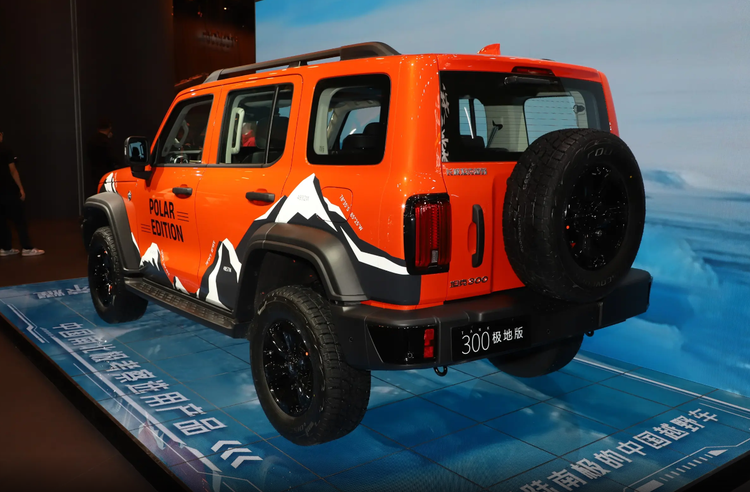 坦克300极地版在外观方面,延续了现款车型的设计风格,采用“极地橙”车身颜色,车身一些细节还增加了极地版专属车身拉花,侧踏板采用固定式,极地版还标配全地形轮胎和内置绞盘,轮胎的尺寸为265/65 R17,车身尺寸方面,极地版的长宽高分别为4750x1930x1903毫米,轴距为2750毫米。