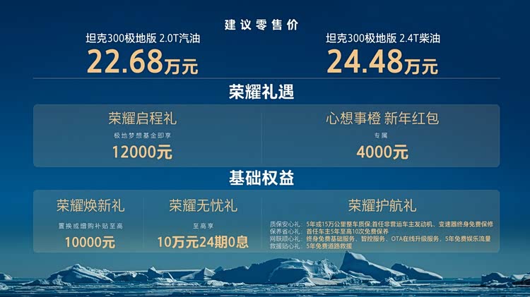 2025年12月11日, 坦克300(参数|询价)全球用户突破50万的节点上,极地版正式上市。售价分别是汽油版22.68万元,柴油版24.48万元,再加上实打实的购车礼遇,这波操作让不少越野迷直呼“诚意拉满”。