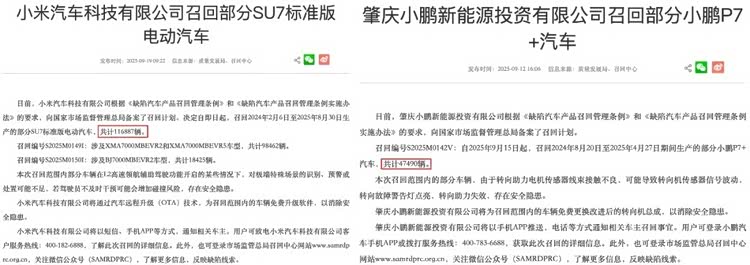 9月,小鹏宣布,因转向助力电机传感器线束接触不良,召回47490辆小鹏P7+;同月,小米汽车因辅助驾驶存在安全隐患,召回116887辆小米SU7标准版。