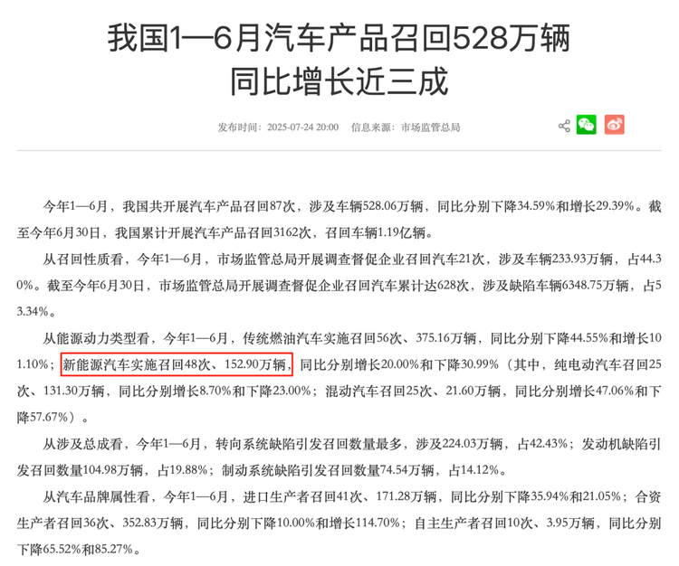 国家市场监督管理总局数据显示,今年上半年,新能源汽车实施召回48次,同比增长20%,合计召回车辆152.9万辆。