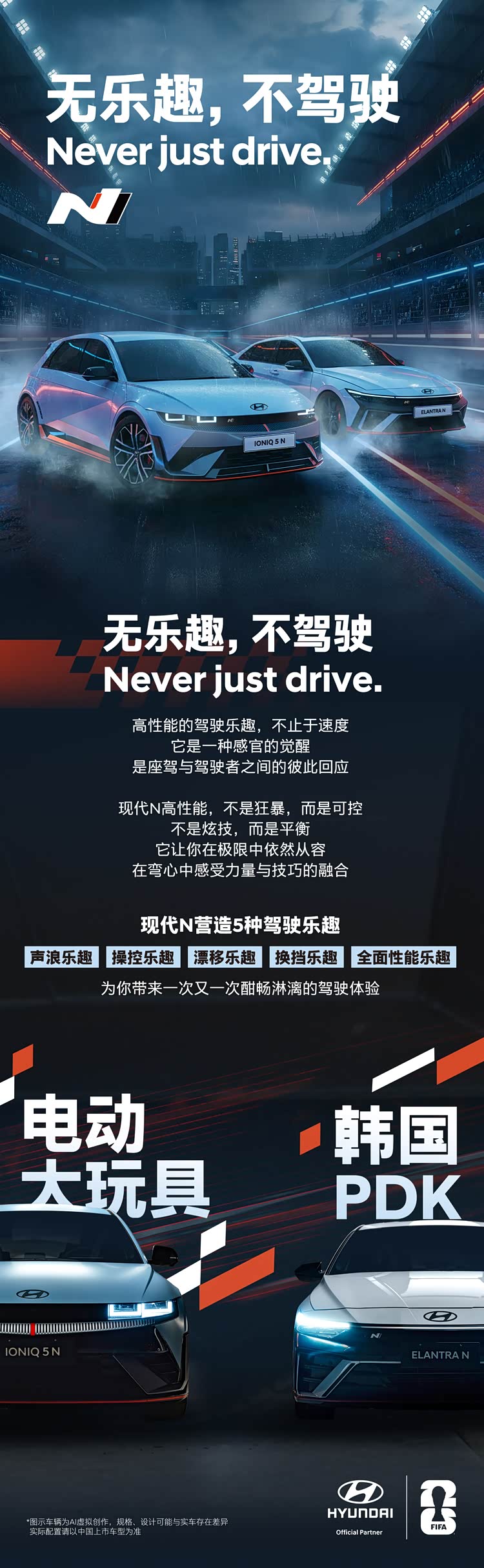 今年,现代汽车N品牌还通过多元化的方式与用户共建驾驶乐趣的新叙事。品牌首先通过官方微博发起的"Never just drive无乐趣,不驾驶"主题活动,广泛征集用户对驾驶乐趣的理解与故事。活动不仅让用户参与到品牌理念的构建中,更为后续的互动奠定了良好基础。随后,N品牌将在更多平台开展内容共创计划,邀请更多媒体与用户共同参与,以多种形式、多维度展现驾驶乐趣的丰富内涵。旨在构建一个以驾驶乐趣为核心的社群生态,使"Never just drive"从品牌理念转化为用户可感知、可参与的生活方式。