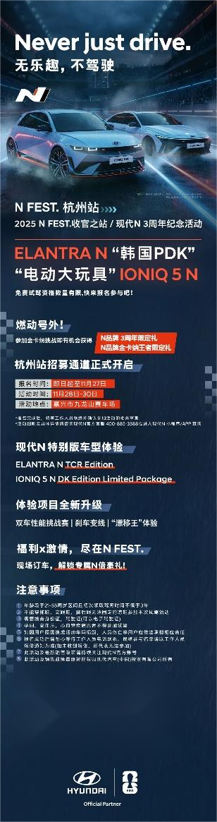 庆典的狂欢暂告段落,N品牌的驾趣征程仍将延续。11月28-30日,N品牌还将在杭州举办N Fest金卡纳竞速狂欢,活动将始终贯穿"Never just drive"的品牌理念,为参与者提供全方位的驾驶体验。在金卡纳赛道中,参与者可以在专业指导下亲身感受N品牌旗下两款明星车型Elantra N及IONIQ 5 N(艾尼氪5 N)。特别值得一提的是,现场还可以体验Elantra N TCR Edition、及装载了DK限定版性能套件的IONIQ 5 N(艾尼氪5 N)两款特别版车型的卓越性能,亲身感受N品牌产品所带来的独特魅力。