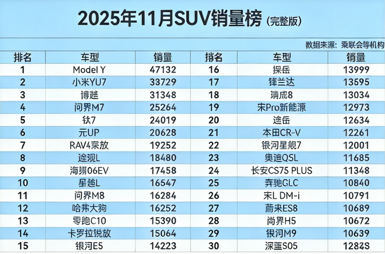 乘联会最新发布的11月SUV销量榜,像往车市扔下了一颗“深水炸弹”。当特斯拉Model Y以超4.7万辆的夸张数据一骑绝尘时,人们才惊觉,这场由电动化与智能化主导的“权力游戏”,洗牌速度远比想象中更残酷。曾经的销量顶流比亚迪 宋PLUS新能源(参数|询价),竟悄然滑落至第42名,这一幕让整个行业都倒吸一口凉气——没有谁的王座是永恒的。