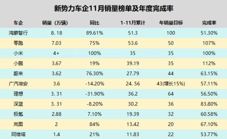 2025年11月的新势力销量榜,直观展示了新旧势力的更替。鸿蒙智行、零跑和小米构成了新的头部阵营,而蔚来、小鹏、理想则退居其后。
