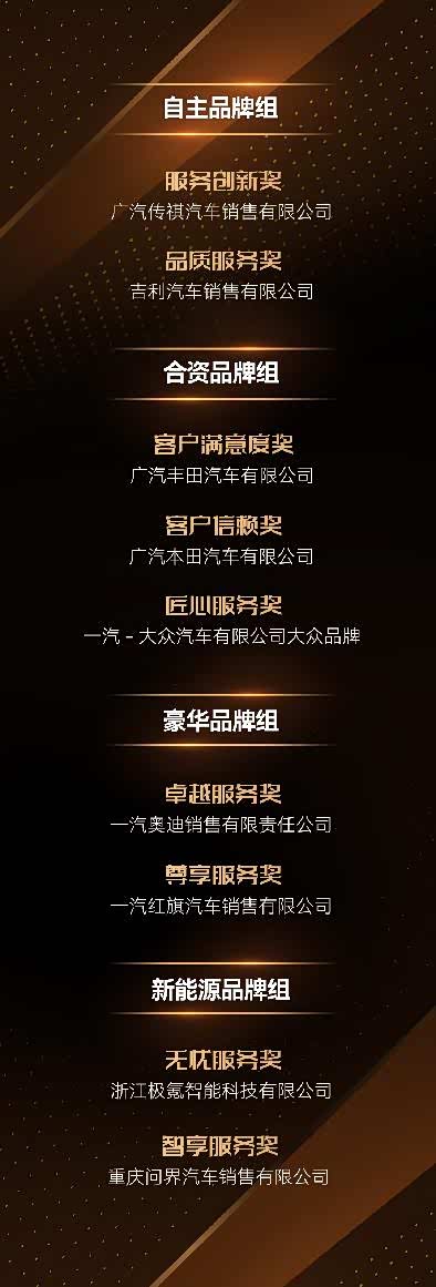 2025(第二十届)中国汽车金扳手奖评选共设置4个组别,分别为自主品牌、合资品牌、豪华品牌、新能源品牌,依据评选标准及评审结果,最终广汽传祺、吉利汽车荣获自主品牌组年度奖项,广汽丰田、广汽本田、一汽-大众大众品牌荣获合资品牌组年度奖项,一汽奥迪、一汽红旗荣获豪华品牌组年度奖项,极氪、问界荣获新能源品牌组年度奖项。