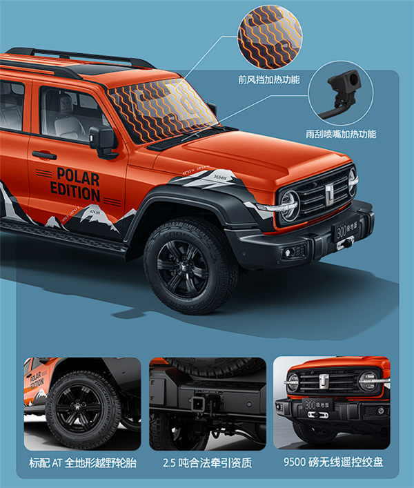 相较于普通版,极地版拥有几项专属升级,配备支持远程控制开启的前风挡加热功能、支持自动开启的雨刮喷嘴加热功能、原厂AT全地形轮胎(265/65 R17)、9500磅无线遥控绞盘、2.5吨牵引资质。