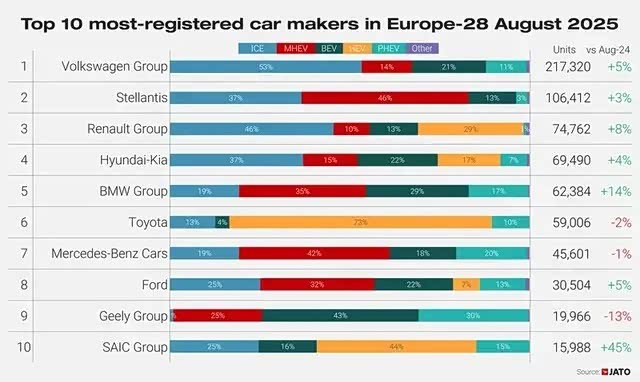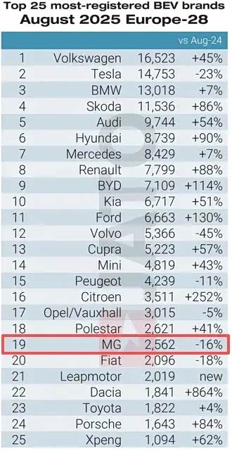 数据清晰印证了这一策略转变。以上汽MG品牌为例,JATO Dynamics数据显示,2025年8月纯电车型销量为2562辆,同比下滑16%。