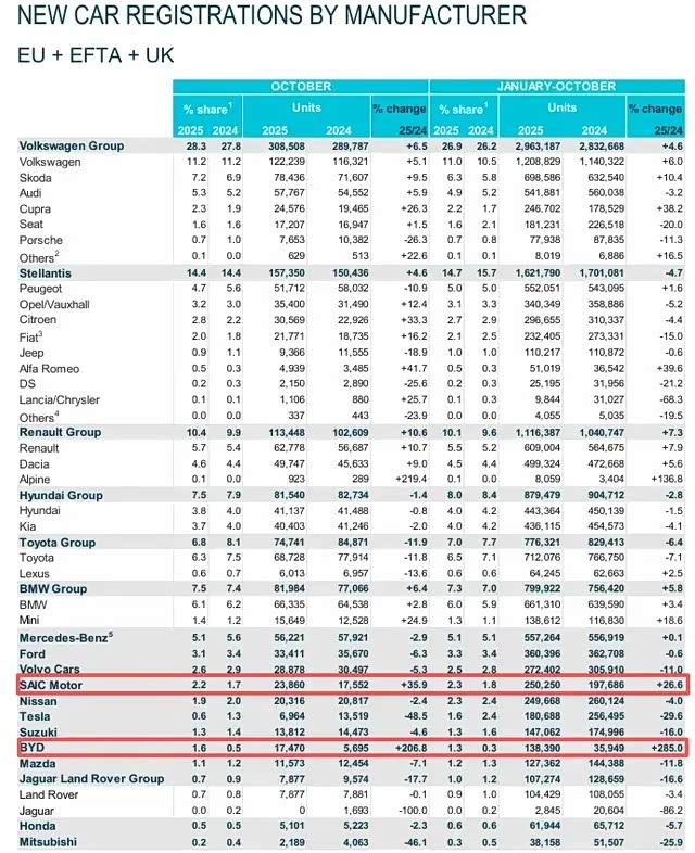 根据欧洲汽车制造商协会 (ACEA)的数据,上汽作为欧洲市场上销量最高的中国车企,截至2025年10月累计销售250,250辆,同比增长26.6%。该品牌通过大力推广插电混动车型,预计全年销量将突破30万辆。