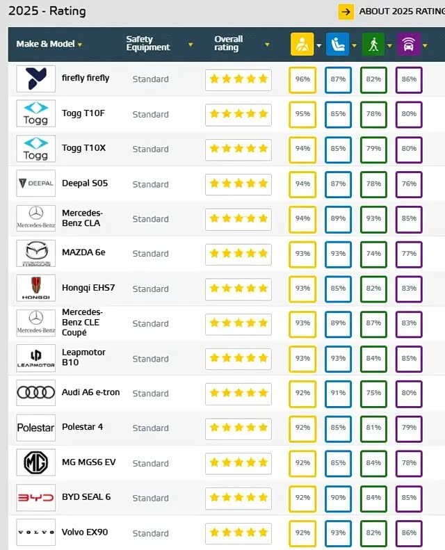 然而,更关键的是技术形象的彻底转变。过去“便宜但低质”的标签已被打破。在2025年欧洲最严苛的Euro NCAP安全测试中,送测的中国车型超过20款获得了最高五星评级,远超行业平均水平。例如,蔚来萤火虫在成人安全保护项目中取得了96%的高分,甚至超越了所有欧洲本土品牌。