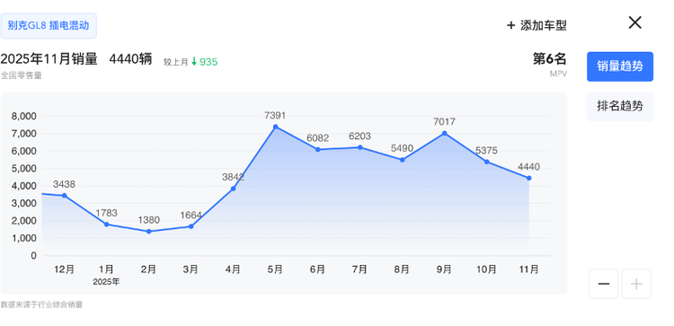 横向的结论是,岚图梦想家和竞争对手之间发生了销量上的断层。以11月销量为例,它约等于腾势D9的2倍,也超过了腾势D9+GL8插混的总和。第一名的成绩,超过第二名和第三名之和。
