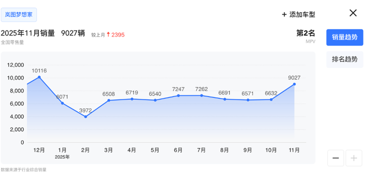 这之中,9月15日,2026款岚图梦想家上新,售价区间为32.99-43.99万元,并且首次搭载了华为乾崑ADS4与鸿蒙座舱5。从单车型的销量走势来看,在新款上市之后,销量的增长速度明显加快,目前11月所交出的9027辆也刷新了今年的单月销量新高,预计今年12月时,这个数字大概率会进一步冲高。