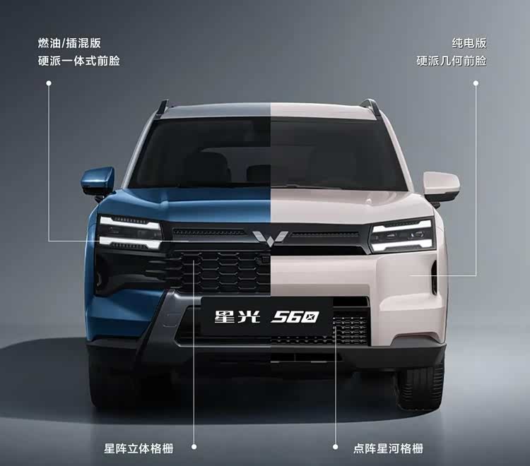 星光560前脸采用双生前脸设计:燃油版和插混版采用硬派一体式前脸搭配星阵立体格栅;纯电版则为硬派几何前脸搭配点阵星河格栅的设计。