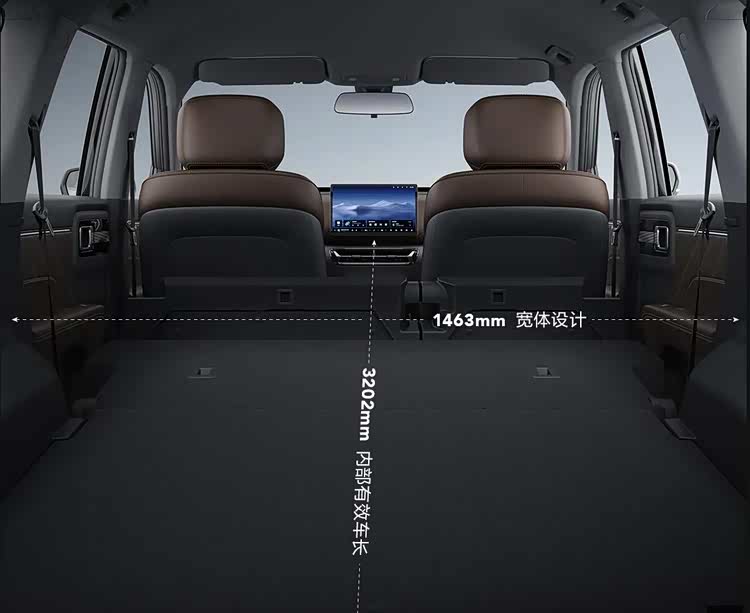 车辆内部有效车长达3202mm,拥有1463mm的超宽体设计。车内空间灵活前排座椅可180°大角度放平;后排支持4/6分比例放倒且靠背可调至125°。