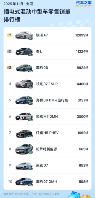 翻开2025年11月插电式混动中型车零售销量榜单,银河A7以12899辆的成绩稳居榜首,不仅实现连续四个月月销破万,更成为同级别中唯一单月销量破1.2万的车型。这款以“造每个人的智能精品车”为理念的车型,跳出同质化竞争,用越级实力和贴心设计,精准击中家庭用户核心需求,8.18万起的限时售价搭配丰厚购车权益,让高品质出行触手可及。